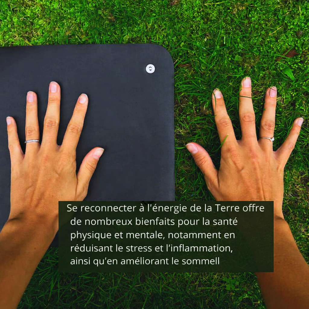 avec une surface conductrice comme un tapis de mise à la Terre. Lorsque vous êtes mis(e) à la terre, l’excès de charges électriques et la pollution électromagnétique accumulée dans votre corps se déchargent en toute sécurité dans la Terre. Ce processus peut aider à équilibrer le système nerveux, réduire l’inflammation, améliorer le sommeil et favoriser un bien-être général, un peu comme marcher pieds nus sur un sol naturel.